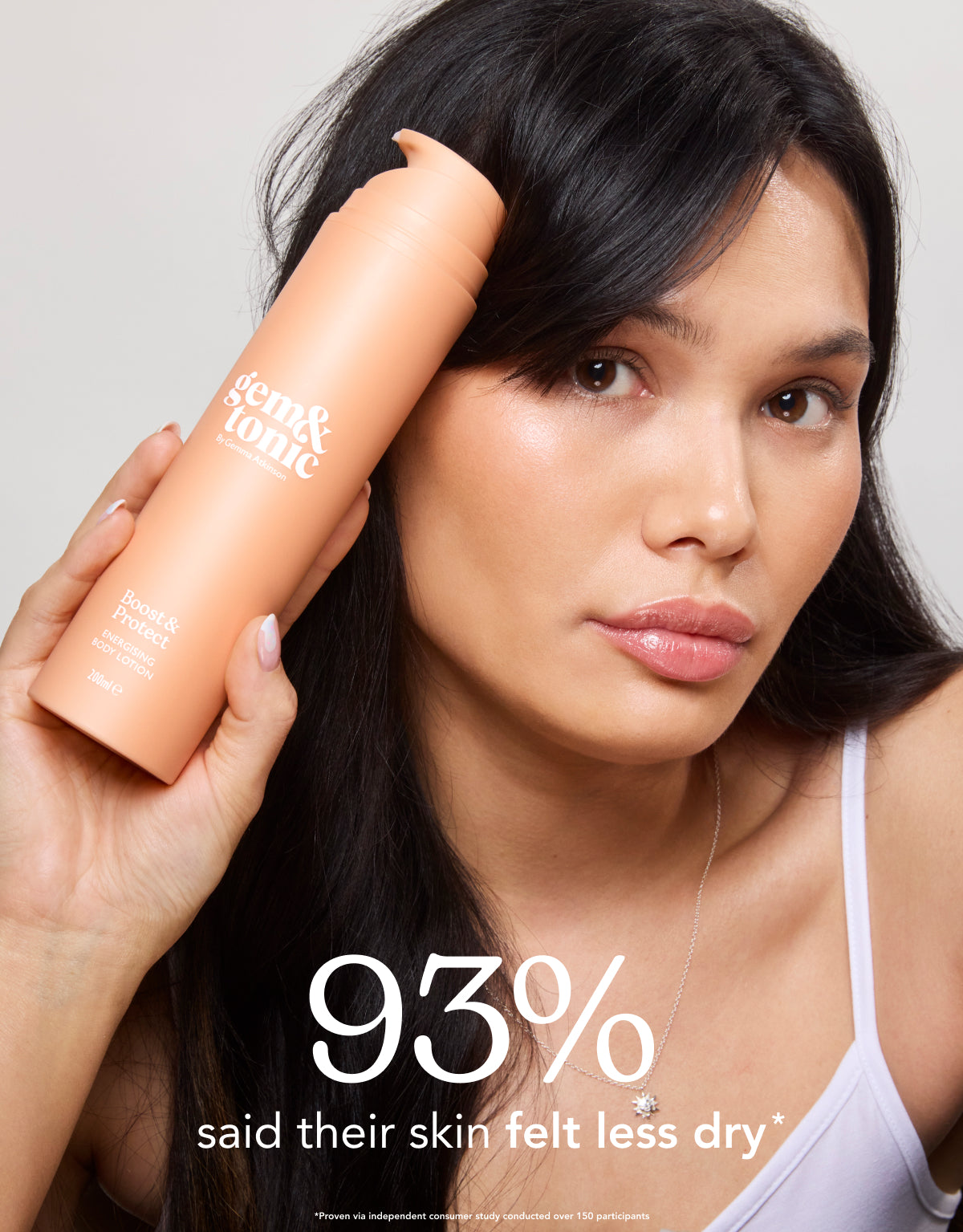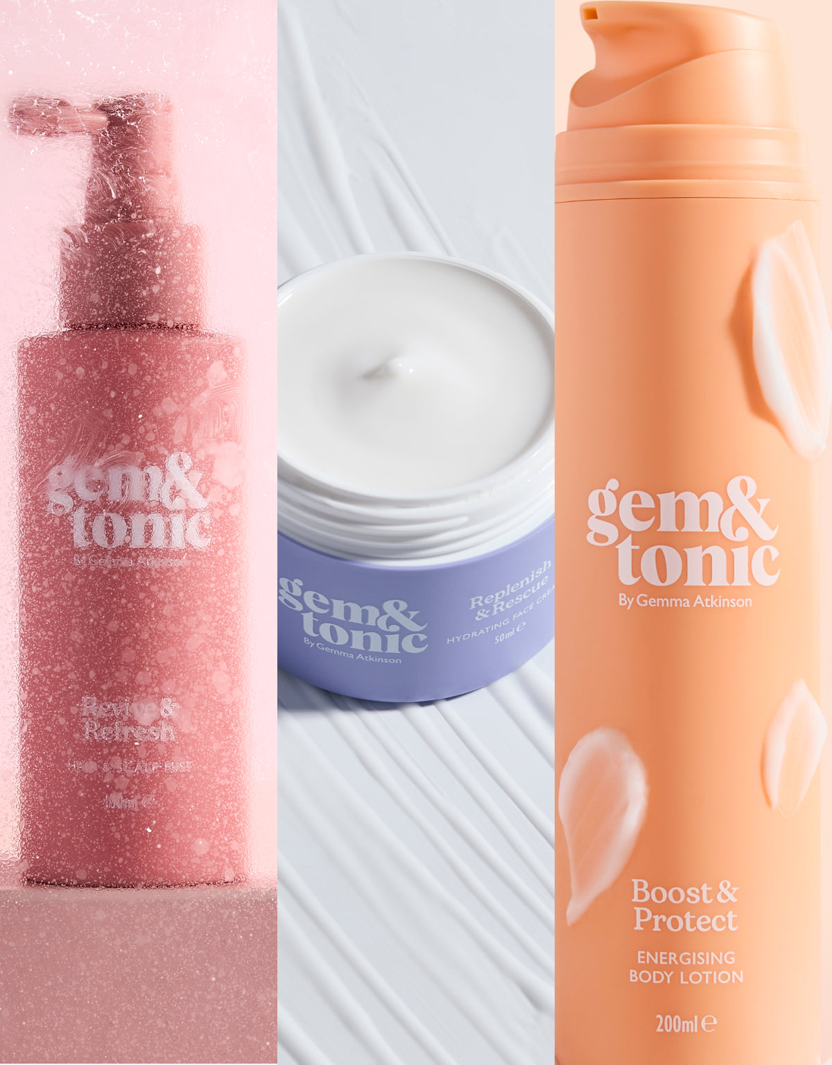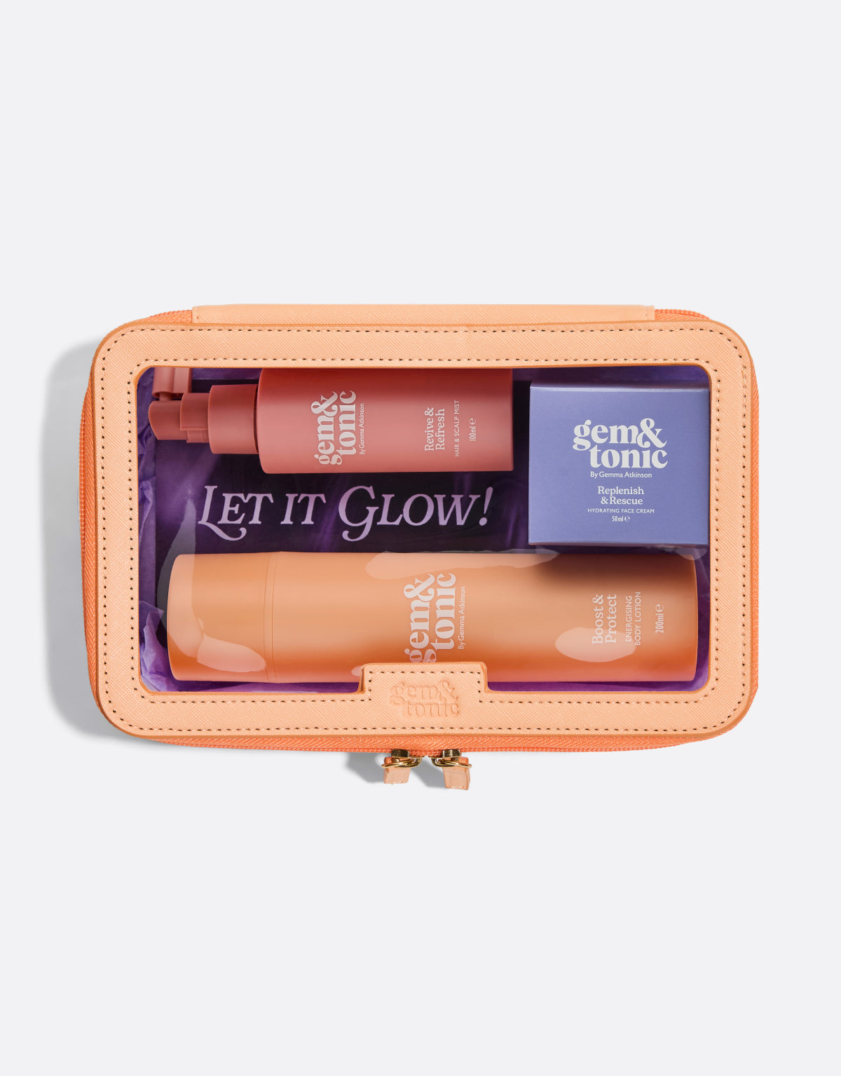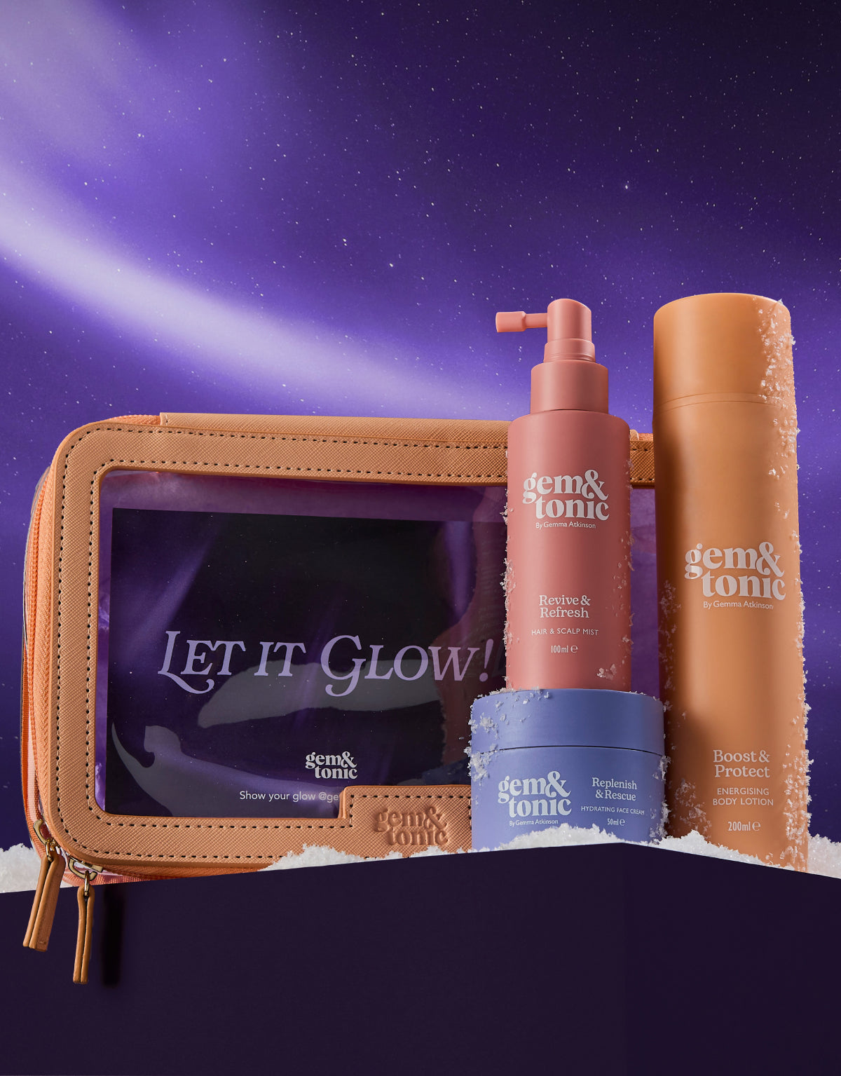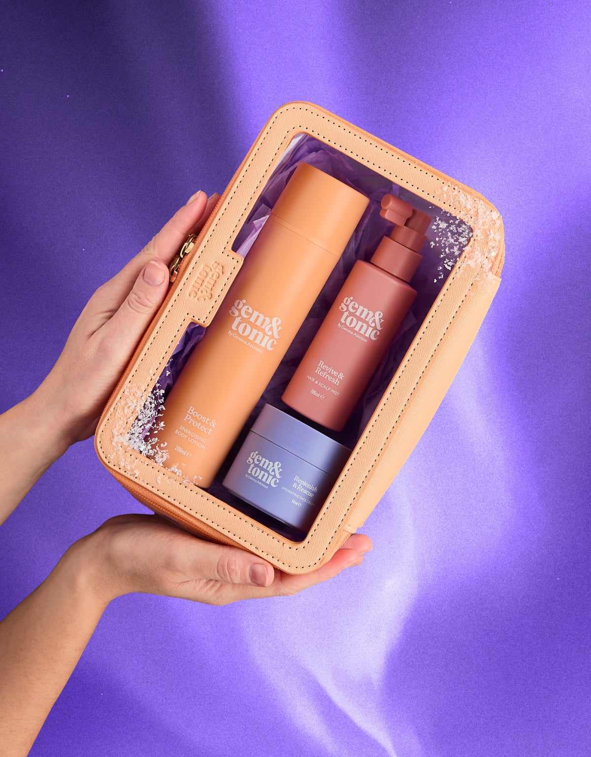 Indulge yourself or someone special with the complete Gem & Tonic collection, beautifully presented in our limited-edition cosmetics bag.